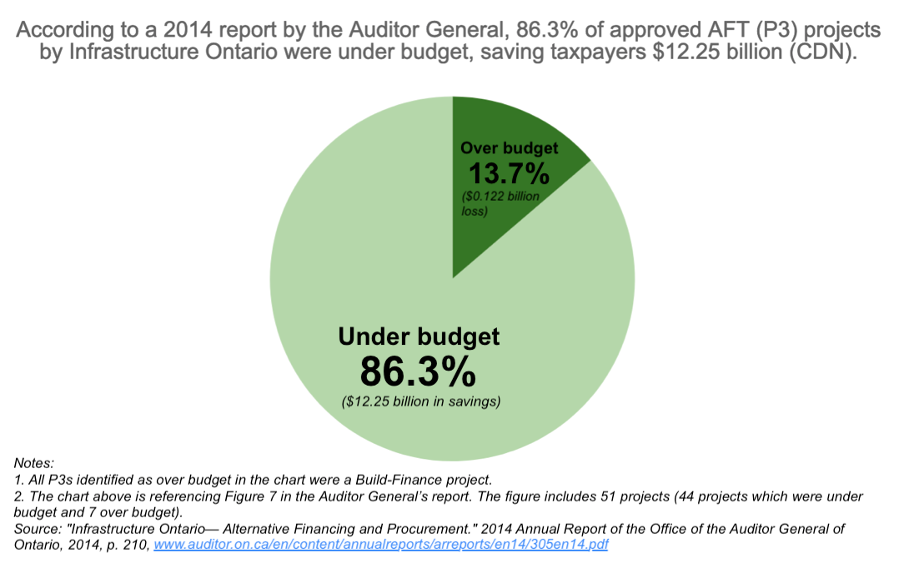 While it can be argued that the P3 delivery model led to these delays and cost overruns, it is challenging to argue this case without more publicly available information. P3s can bring in numerous benefits. In comparison to direct government procurement, P3s benefit from specialized expertise, decreased costs through competition in awarding contracts, and better infrastructure maintenance in the long-run. Moreover, the Government of Ontario reviews its P3 initiatives with an extensive Value for Money (VFM) process, which involves multiple government departments reviewing and analyzing these projects, typically in collaboration with Infrastructure Ontario and private-sector consulting firms such as Altus Group and MMM Group. Notwithstanding the many challenges in building the Eglinton Crosstown, studies show that the majority of P3 projects in Ontario are under budget compared to the traditional delivery method (see Figure 1). Moreover, of the 51 Public-Private Partnership projects reviewed by the Ontario Auditor General in 2014, 86% of the infrastructure projects were under budget, saving taxpayers $12.25 billion (see Figure 1). These factors show that P3s have been a generally successful method of financing public infrastructure in Ontario.