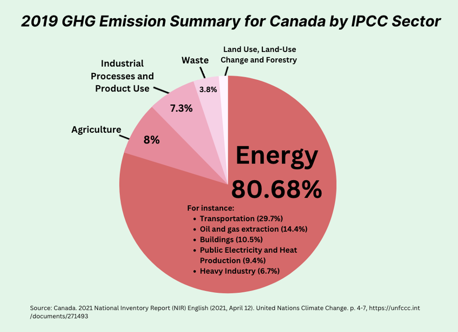 In March 2022, the Government of Canada released its 2030 Emissions Reduction Plan, a report outlining Canada’s next steps for meeting annual emission reduction targets towards 2030. In order to reach 2030 reduction targets, emissions are broken down annually across eight economic sectors including oil and gas, transportation, heavy industry, and buildings. In breaking down the responsibility of emissions by sector, this infers that certain sectors in society are currently emitting too much GHG emissions. However, the problem statement to climate change is not that humans are emitting too much. Rather, the large amount of GHG emissions produced is a consequence of our system dependence on fossil fuels. In 2019, 80.7 per cent of Canada’s GHG emissions came from energy production and the end-use of fossil fuels (see pie chart below). Thus, the real question becomes how can society become less dependent on energy sources that release emissions both during its production process and end-use?